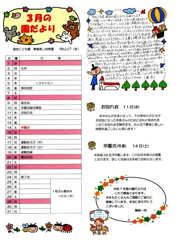 これからの時代はますます変化が激しく、先の見通しがつきにくい出来事が増えてくるかもしれません。けれど『ひとりじゃない』と思える繋がりがあれば、必ず前へ進む力が湧いてくるはずです。人との繋がりに支えられた私が再び、この園に戻ってきたことはきっと意味があると感じています。青竜第二幼稚園が💗つながり💗を育てる温かい場所であり続けられるように・・・この園で出会った全ての子ども達が自分の手で新しい繋がりを広げていけるように・・・そんな思いを胸にみなさまと共に歩んでまいります。